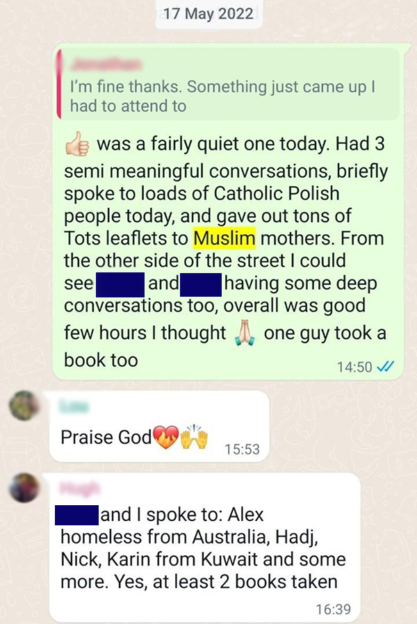 Muslim lady follows the Christian faith Sometimes prayers can take a while to be answered. But when they are the feeling of joy is so very much worth the wait. Our next testimony is a lady who was a Muslim but has now decided to follow the Christian faith. We met this young lady in 2022. Here is a WhatsApp message dated 17th of May 2022. This was the first time we spoke to this Muslim lady. ![]() Dean was praying in the Admiral pub. Here are the prayers written in a journal asking the Lord to bless our street work projects. ![]() After prayer the Lord tells Dean to go to a community centre. Dean thought he was crazy, why would he go down there? Well he went anyway! It turned out that it was a community fun day being held at the centre where there were many Muslim families in attendance. Dean ended up talking to a Muslim lady at the festival which he didn't even know was taking place. Here is the prayer spoken with regards to the flyers after our encounter. ![]() In December 2023 we heard that this lady had decided to follow the Christian faith. Then on the 7th of January 2024. We were blessed to be at the lady's baptism as well as seeing her son get baptised. ![]() It so important to pray because the Lord is listening and moving through them. It shows that the Lord is working everything for good and in His time. The Lord planting and watering seeds that are leading people to salvation. We admire and respect all people who follow a faith. We often see that people of faith do have things in common such as strong unity and relationships with family and friends. We were blessed to see a lady come and follow the Christian faith as is her right to do in the UK. We give Jesus all the glory. |