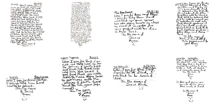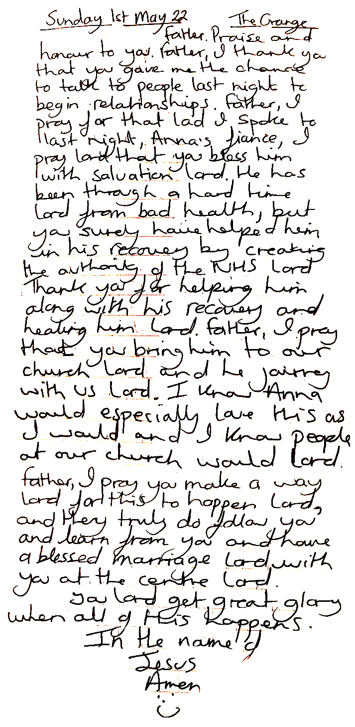Prayer leads to salvation We all know that it is not just prayer (although it is hugely important) that helps bring people to salvation. God uses many people to water seeds that lead people to salvation. On another occasion Dean felt the Lord to accept a birthday party invitation and that he should go and talk to someone at this occasion. Dean went along and shared his testimony. To which three years later Dean finds out that this person has given his life to Jesus. You see it is all in Gods timing. While Dean gave his testimony, Dean continued to pray for this person. Dean is a keen prayer journaler. Here are visual examples of prayers asking the Lord to bring this man to faith. ![]() Here is an example of one of those prayers Dean has written for this man asking the Lord to lead him to salvation. ![]() In 2025 we have now found out that this man has given his life to the Lord and is regularly attending church. This is what we are here to do at Finding Hope in Jesus. We will scatter the seeds, pray fervently and glorify God when we here of salvations and breakthrough. |