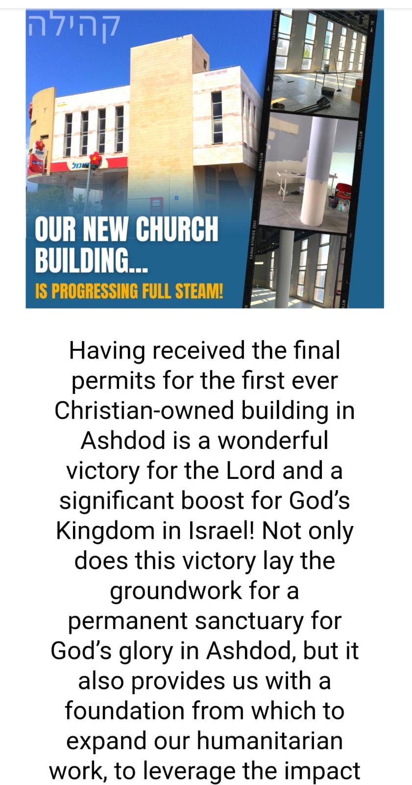 Glory to God for answering prayers for Israel![]() We were taken care by a church in Ashdod. They were having all kinds of problems with the church plant with local councilors in the city hall not granting permits for their building. But once again Jesus has answered yet another prayer. Firstly here is the prayer written down before we started prayer journaling. ![]() The good news is the final permits for the first-ever Christian owned building in Ashdod have been received. This is a wonderful victory for the Lord and a significant boost for God’s Kingdom in Israel! This victory lay's the groundwork for a permanent sanctuary for God’s glory in Ashdod, Israel. Here is a snippet from Beithallel Israel. ![]() Read more here about the Lords victory. https://www.beithallel-israel.org/video/our-new-building-is-progressing-full-steam/ God the one who hears all prayers. |