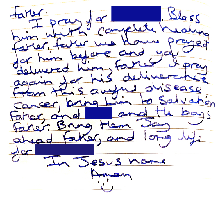 We received a prayer request from someone who had liver cancer in 2020. We prayed and when the doctors operated the cancer had dissapeared and was not present.