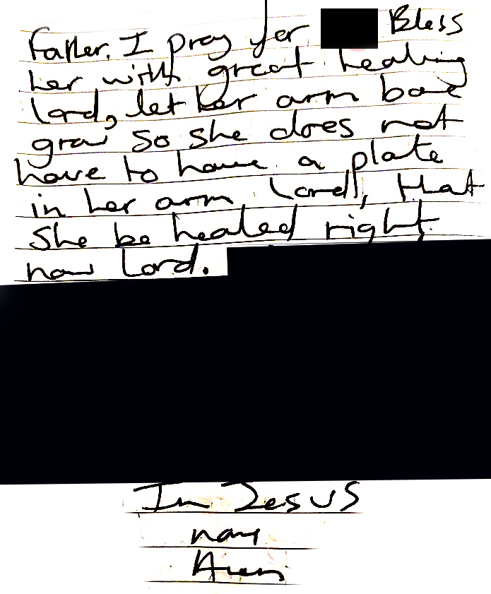 The reason for this was due to the ladies age. The doctors said it would be difficult for the bone to grow back. But praise be to Jesus. We prayed and the bone did grow back