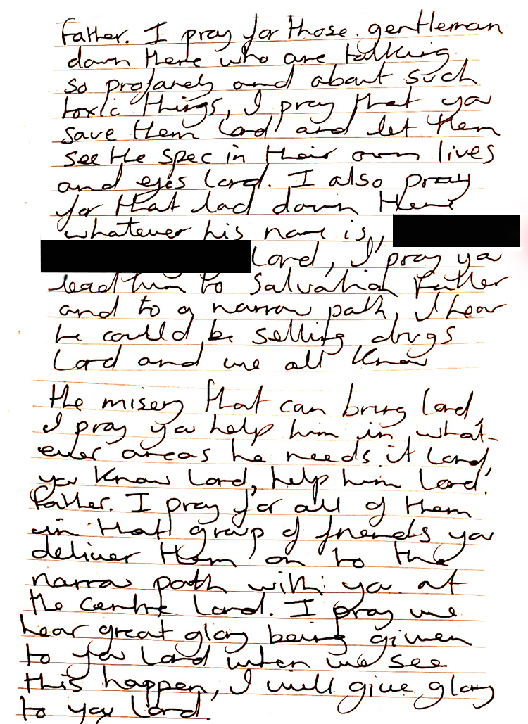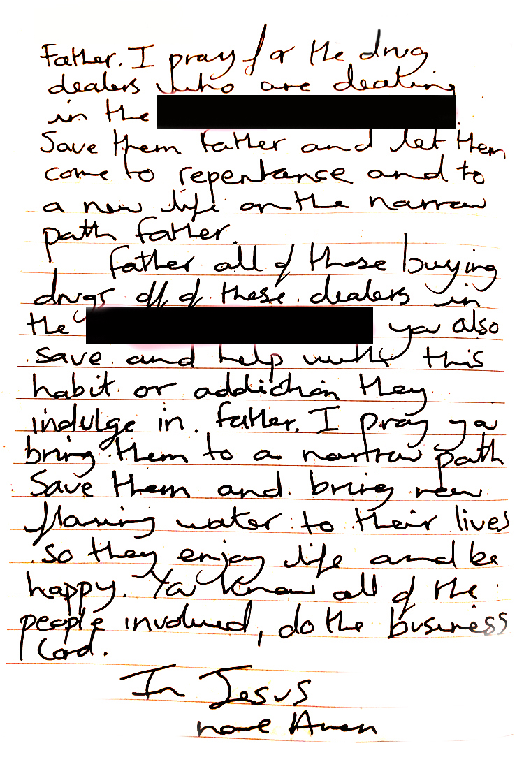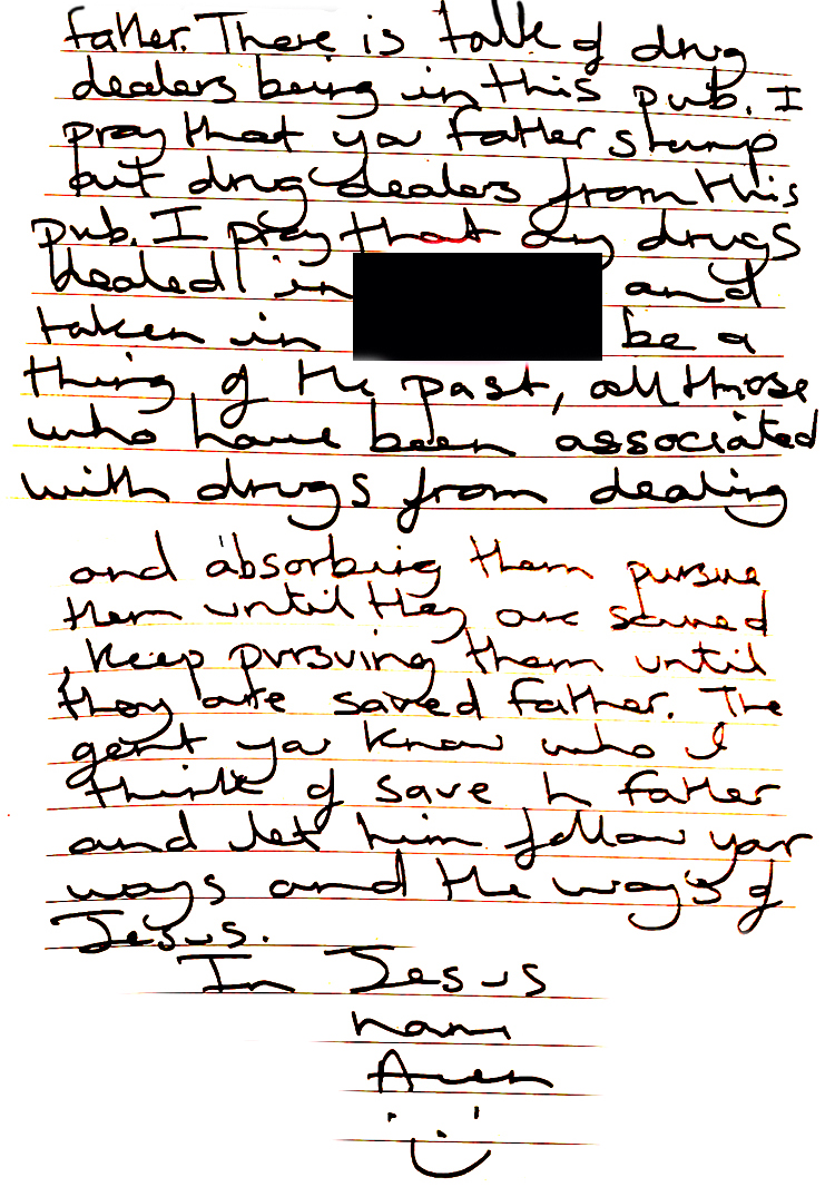 praying about local drug dealers in a local pub. All glory to God, all drug dealing has ceased and has been moved along from the local area. There is nothing ever more true than this